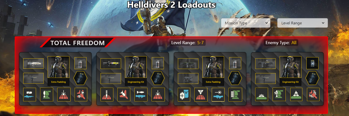 In addition to the Galatic War Map we have a section that displays fun, strong, and interesting loadouts for squads ranging anywhere from 1-4 players. You can sort these loadouts based on effectiveness for specific difficulty levels, enemy types, and mission types. Note that at its core Helldivers 2 is game where you can run just about anything and find success. However, we hope to provide new players, and veteran players looking for some extra synergy, or some new ideas, additional information surrounding loadouts and what they can bring to the fight to find success. Some stuff is obvious, like mortars to defense missions, and others more fun, like our Explosions Only Strategem setup.